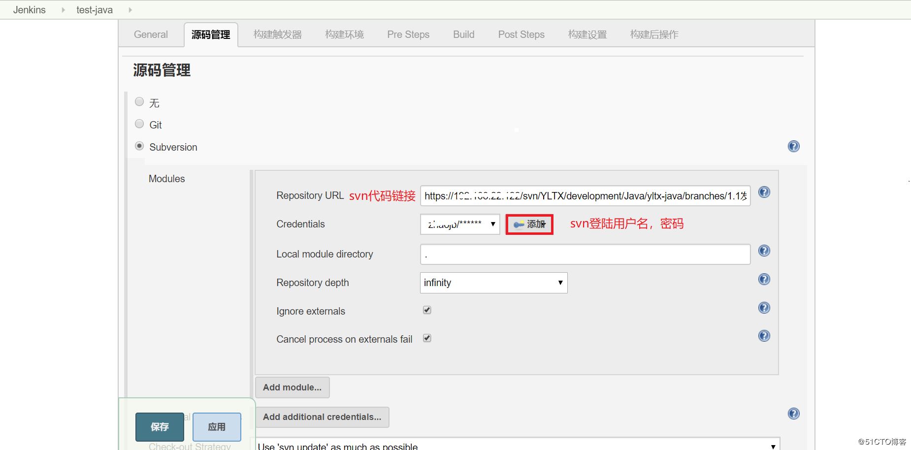 (3)填写源码管理,svn拉取代码地址,用户登录名