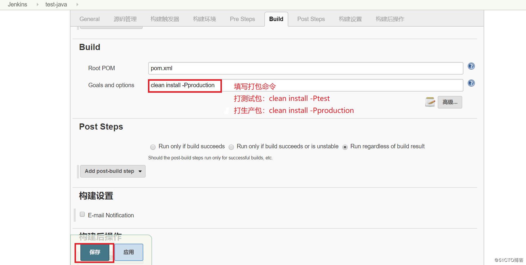 (4)在构建设置中,填写打包命令,保存(打包命令以公司svn配置为准)