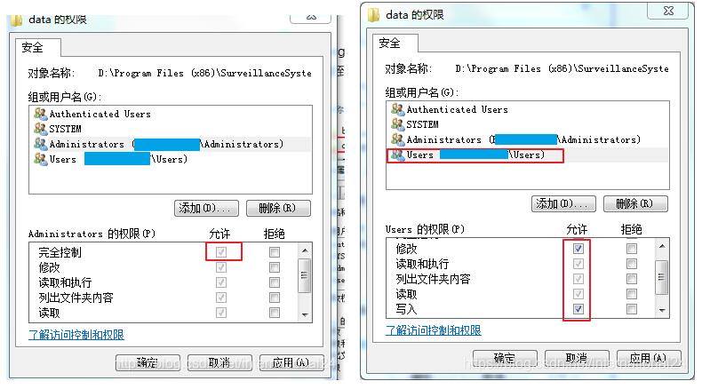 2. 确保System 和 Administrator 拥有“完全控制”权限。Users 用户组默认只拥有“读取和执行”,“列出文件夹内容”和“读取”3种权限。当启动数据库提示“权限不足”时,应再添加“修改”和 “写入”。