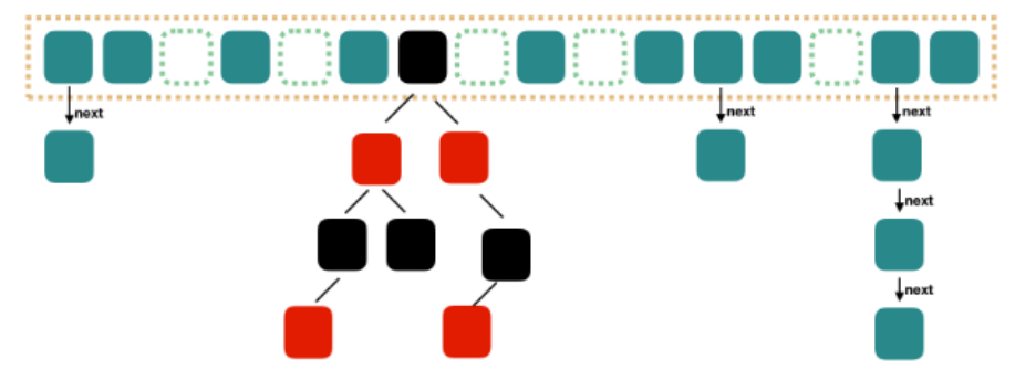 //如果链表长度已经达到临界值 8 就需要把链表转换为树结构