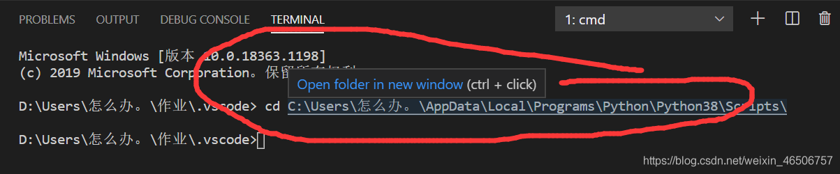 当然若在输入“cd+格式+刚才复制的路径+\Scripts\”之后,并未跳出Scripts的路径,而是和我一样只有vscode的路径(如下图所示)