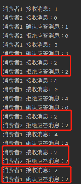 可以看出序号为2的消息3次被消费者2接收,消费者2也3次发送拒绝应答,直到第4次才被消费者1接收,并返回确认应答。