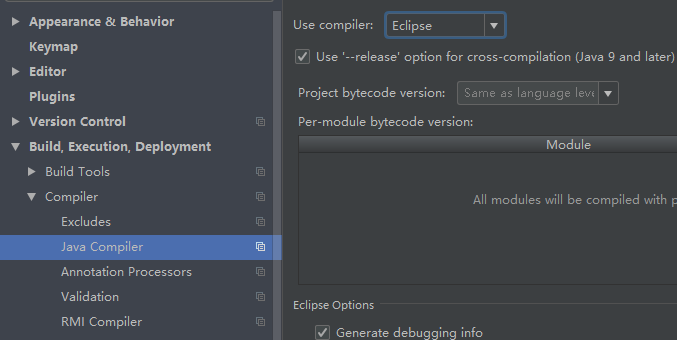 更改编辑器:将Use conpiler 选项更改为Eclipse。这个更改编辑器,貌似不是解决方法。哈哈哈。这个可以忽略。