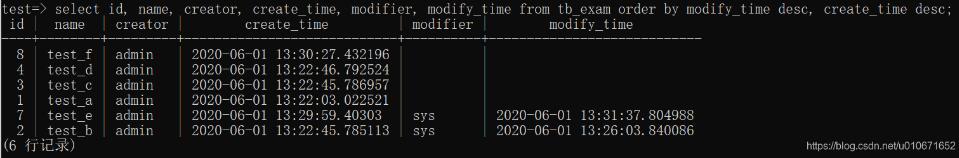 select id, name, creator, create_time, modifier, modify_time from tb_exam order by modify_time desc, create_time desc;