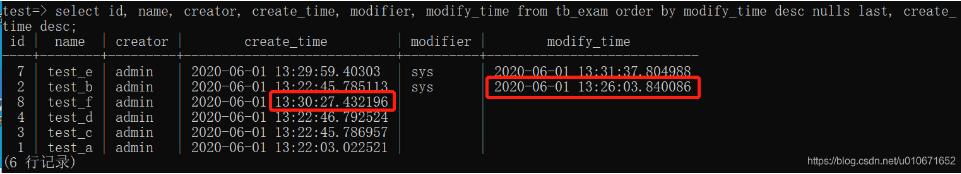 select id, name, creator, create_time, modifier, modify_time from tb_exam order by modify_time desc nulls last, create_time desc;