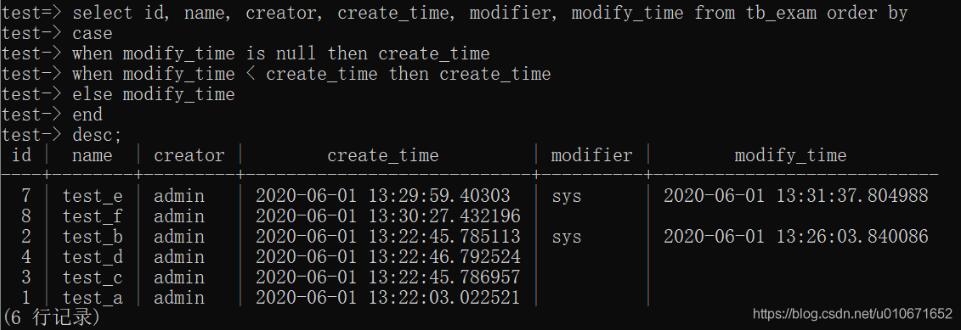 从运行结果可知,该 sql 的排序结果符合需求,实现了 modify_time 和 create_time 的综合排序。