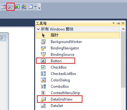 然后使用“工具箱”添加控件:分别添加button,datagridview,textbox三种窗体;