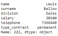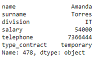 我们选择id号为478的员工的姓名、姓氏和薪水,方法是将一个值作为第一个参数,将一个值列表作为第二个参数,从而获得一个Series对象。