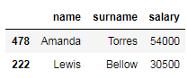 # 按职位选择id号为128、478、257、299的员工的姓名、姓氏和工资 df_employees.iloc[:4, [0, 1, 3]] # 按标签选择id号为128、478、257、299的员工的姓名、姓氏和工资 df_employees.loc[:'299', ['name', 'surname', 'salary']]
