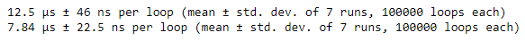 # iloc索引器的执行时间 %timeit df_employees.iloc[1, 3] # iat索引器的执行时间 %timeit df_employees.iat[1, 3]