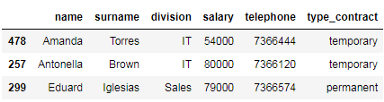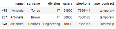 'salary': salary, 'telephone': telephone, 'type_contract': type_contract}, index=id_number)
