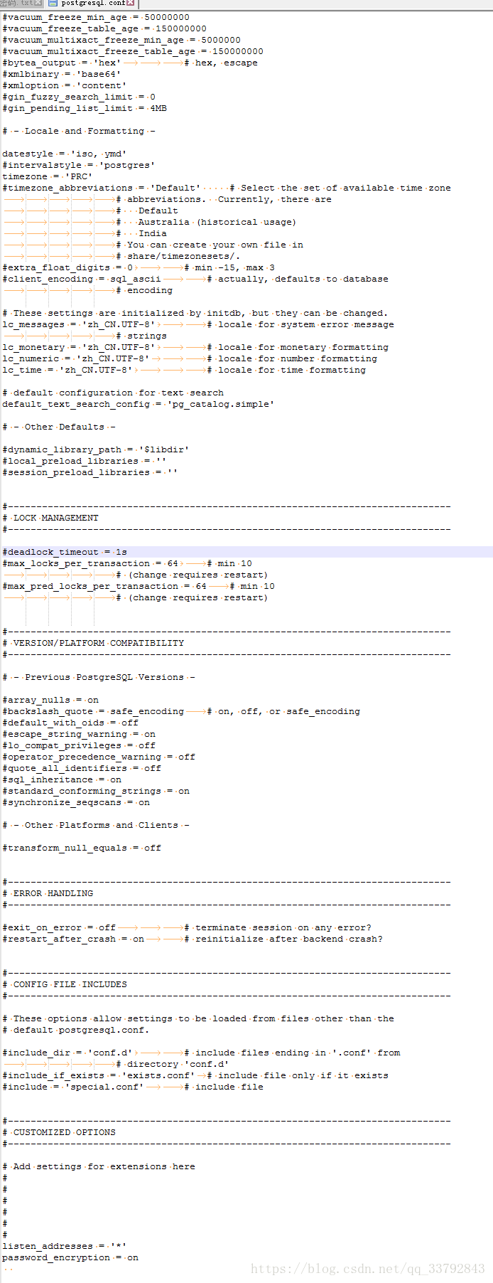 在配置文件C:\PostgreSQL\data\pg96\postgresql.conf 中直接修改,修改前记得备份一下原文件,因为你不知道意外和明天不知道哪个会先来。修改完成之后,记得重启数据库哦。