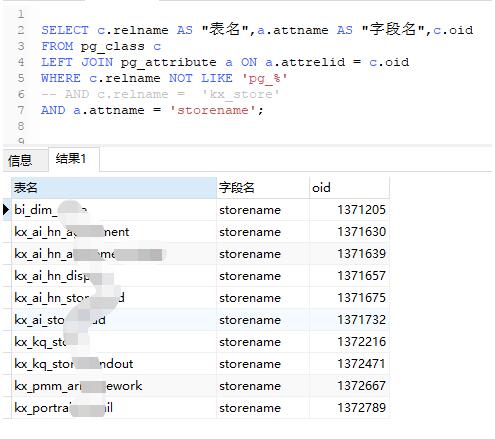 SELECT c.relname AS "表名",a.attname AS "字段名",c.oid FROM pg_class c LEFT JOIN pg_attribute a ON a.attrelid = c.oid WHERE c.relname NOT LIKE 'pg_%' -- AND c.relname = 'kx_store' AND a.attname = 'storename';