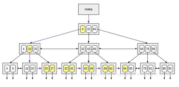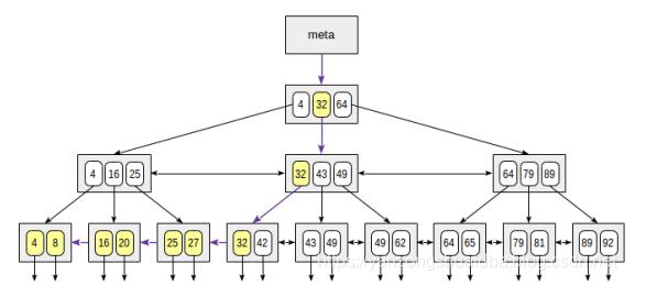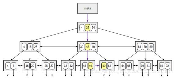 root节点有三个记录:(4,32,64)。从root节点开始进行搜索,由于32≤ 49 < 64,所以选择32这个值进入其子节点。通过同样的方法继续向下进行搜索一直到叶子节点,最后查询到49这个值。