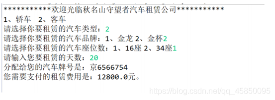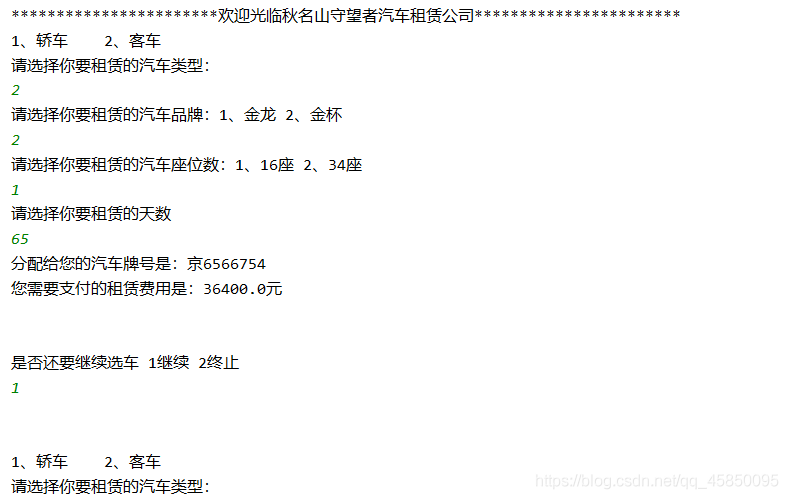 System.out.println("请选择你要租赁的汽车座位数:1、16座 2、34座");