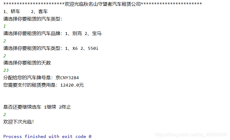 System.out.println("请选择你要租赁的汽车类型:1、X6 2、550i");