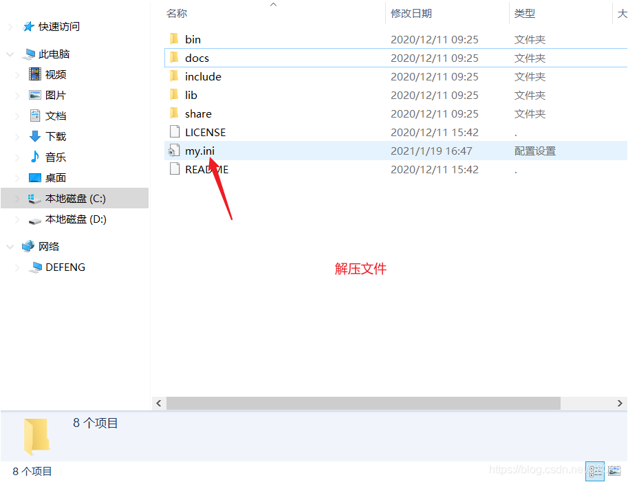 解压后的目录中是没有的my.ini文件的,自行添加的my.ini,写入以下数据