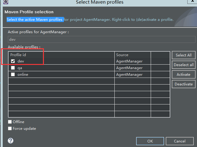 项目右键-->maven-->Select Maven profiles ,选择一个环境,修改最好清理一下项目才生效,我之前没清理,发现没起作用。