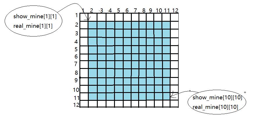 #define row 12 #define col 12 show_mine[row][col];//玩家数组 real_mine[row][col];//设计者数组