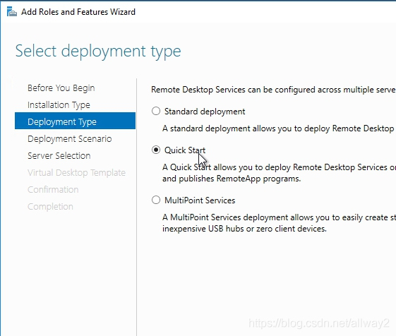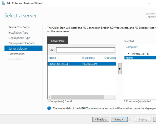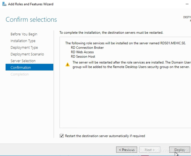 由于我们选择了快速入门,因此将在单个服务器上安装Connection Broker,Web Access和Session Host角色。点击下一步