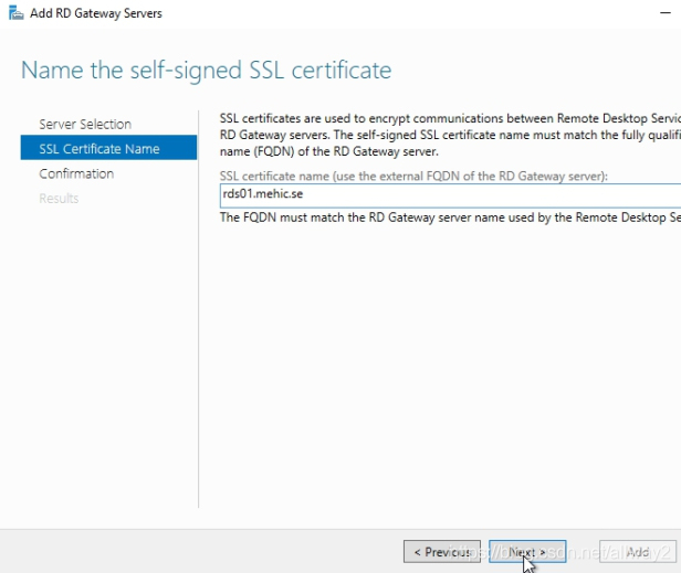 当我们通过向导时,它将创建一个自签名的SSL证书。稍后我将用Trusted替换该证书。在“ SSL证书名称”页面上,我将输入我的RDS服务器rds01.mehic.se的完全合格域名。
