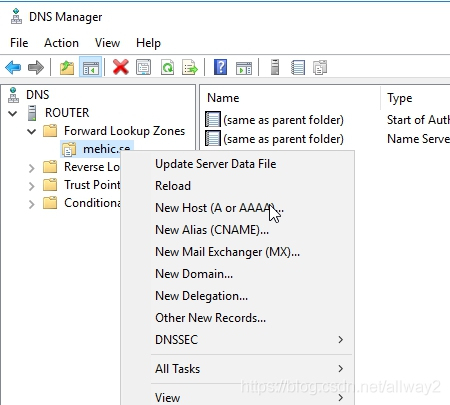 完成后,右键单击新区域,然后选择“新主机”(A或AAAA)