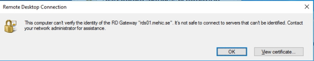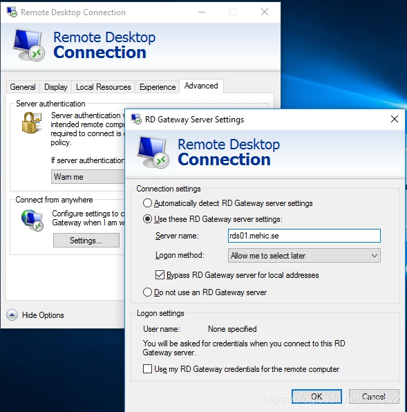 让我们尝试使用RDP连接到RDCB。只需打开运行(Windows Button + R)并输入mstsc。输入RDCB名称,然后单击“高级”选项卡