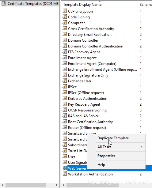 这将打开证书模板管理单元。我们需要做的是从这些模板中选择一个并复制它,以便我们可以根据需要自定义它。对于远程桌面,我们需要的大多数证书都是SSL。右键单击Web服务器模板,然后选择“重复模板”
