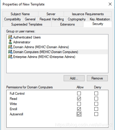 我们可以做很多事情,但最重要的是允许。因此,请单击“安全性”选项卡,并授予“身份验证的用户”注册和自动注册的权限。(OBS!在现实生活中,您可能希望将该证书锁定给特定的人,但在这种情况下,这并不重要。)我还将添加域计算机,并授予他们读取,注册和自动注册的权限。完成后,单击“确定”。