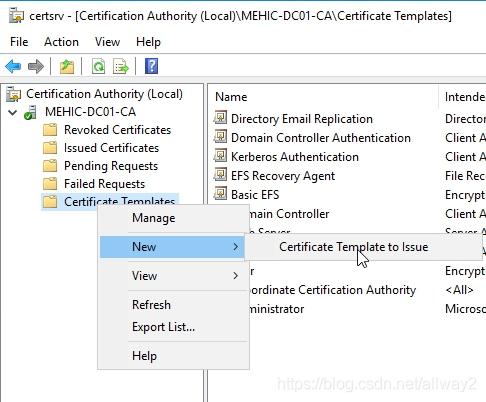 现在,我们需要获取该模板并将其发布到CA。为此,请右键单击证书模板?>新建?>要颁发的证书模板。