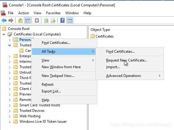 最后一步是注册证书。切换到RDS01并打开MMC(Windows按钮+ R并输入mmc),右键单击Personal-> All Tasks-> Request New Certificate