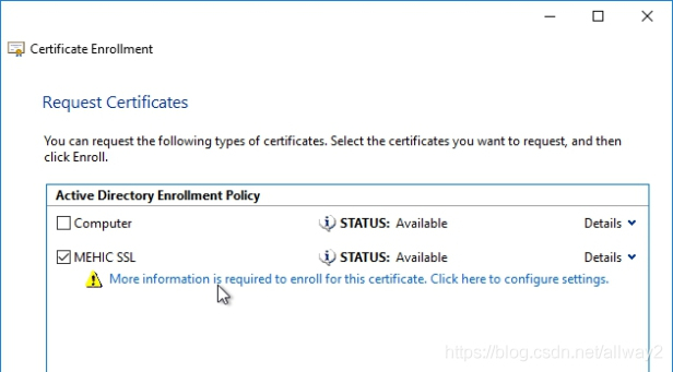 在“ 开始之前 和选择证书注册策略”页上,单击“下一步”。在“ 请求证书”页面上,选择MEHIC SSL,然后单击链接。需要更多信息。(使用SSL,我们必须提供其他信息)