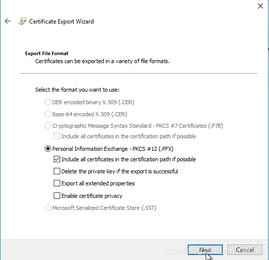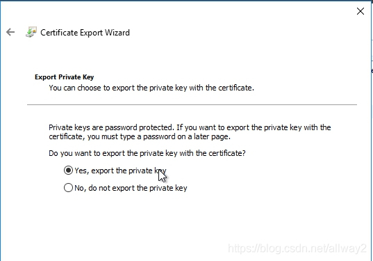 欢迎导出向导将弹出。点击下一步。选择是,导出私钥,然后单击下一步