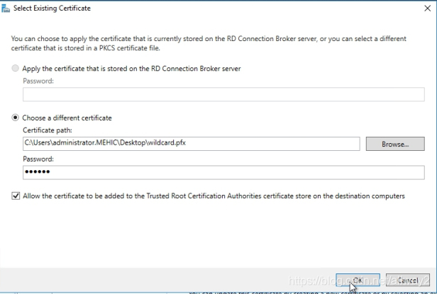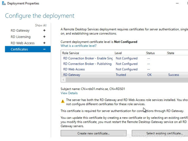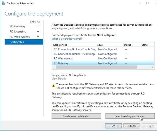 现在,让我们回到“部署属性”并选择RD网关?>选择“现有证书”