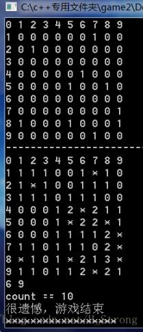 接下来如果flag==1时,开始进行扫描,看看show中还剩下几个星号,如果剩下10个星号,那么就证明扫完了,此时打印获胜信息,并break跳出循环。如果没有剩下10个星号,那么将已有的count信息清除,继续进行以上步骤。