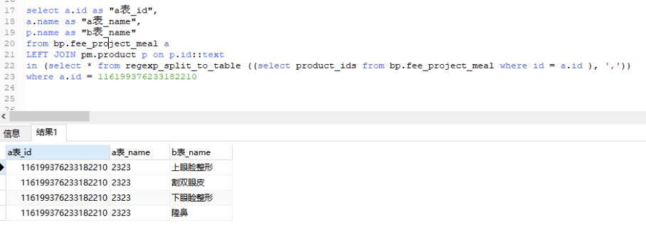 select a.id as "a表_id", a.name as "a表_name", p.name as "b表_name" from bp.fee_project_meal a LEFT JOIN pm.product p on p.id::text in (select * from regexp_split_to_table ((select product_ids from bp.fee_project_meal where id = a.id ), ',')) where a.id = 116199376233182210