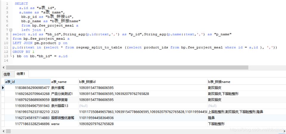 SELECT a.id as "a表_id", a.name as "a表_name", bb.p_id as "b表_拼接id", bb.p_name as "b表_拼接name" from bp.fee_project_meal a left join ( select a.id as "bb_id",String_agg(p.id::text,',') as "p_id",String_agg(p.name::text,',') as "p_name" from bp.fee_project_meal a LEFT JOIN pm.product p on p.id::text in (select * from regexp_split_to_table ((select product_ids from bp.fee_project_meal where id = a.id ), ',')) GROUP BY 1 ) bb on bb."bb_id" = a.id