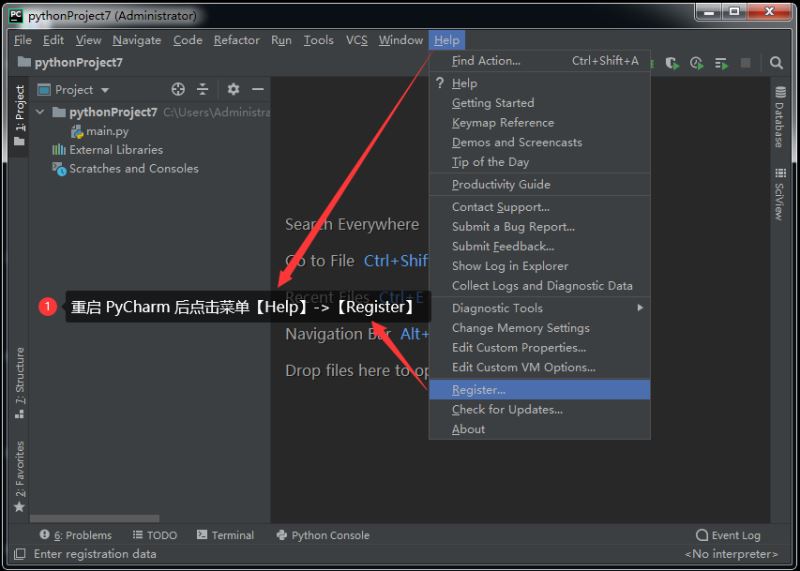 重启 PyCharm 后点击菜单【Help】->【Register】,如下图