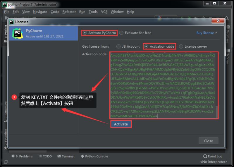 在弹出的激活窗口中输入 key.txt 文件中的激活码然后点击 【Activate】按钮