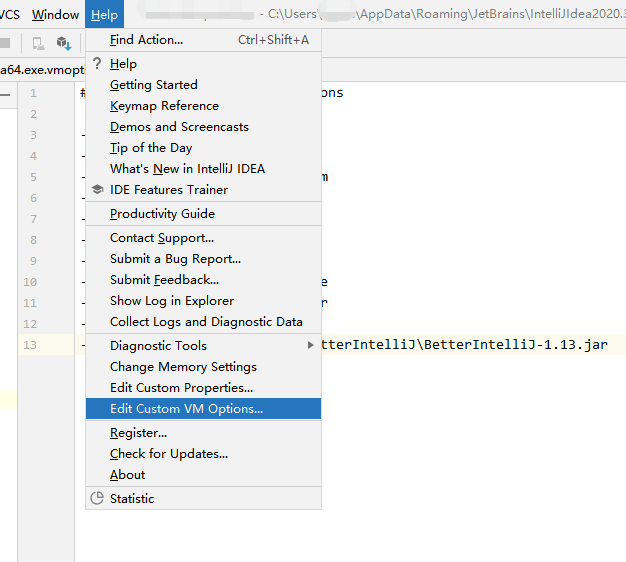 vmoptions找不到?打开IDEA,菜单栏:Help -> Edit Custom Properties,进行修改即可~