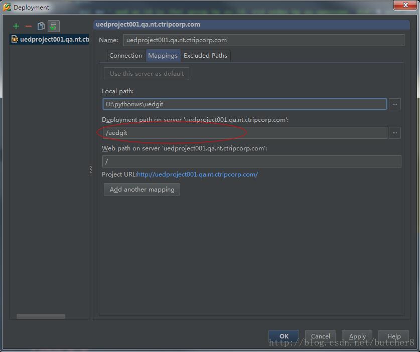 3. 配置Mappings参数设置,进行本地项目路径和远程服务器项目路径的关联:(圈红的是上传到Linux上的哪个文件下)