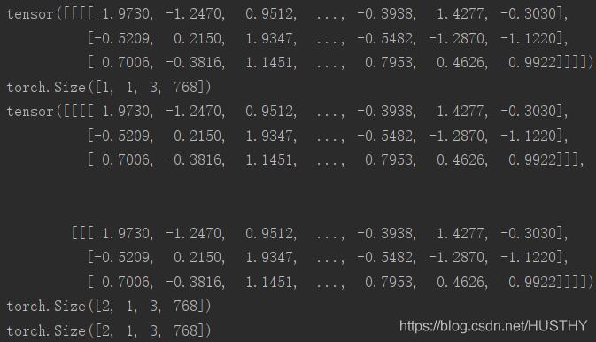 a=torch.randn(1,1,3,768) print(a) print(a.shape) #torch.Size([1, 1, 3, 768]) b=a.expand(2,-1,-1,-1) print(b) print(b.shape) #torch.Size([2, 1, 3, 768]) c=a.expand(2,1,3,768) print(c.shape) #torch.Size([2, 1, 3, 768])