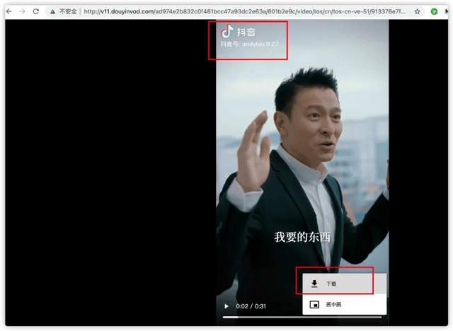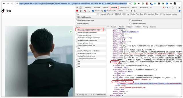 这里面有个 play_addr,内部有个 urllist,我们复制这个 urllist[0] 在浏览器打开,网站跳转到了真正的播放地址,同时可以看到下载的按钮: