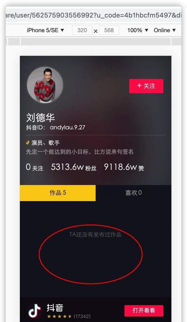 任意打开一个大 V 的个人主页,分享,复制链接,使用浏览器打开,一个视频也看不到,而使用抖音 App 就可以看到: