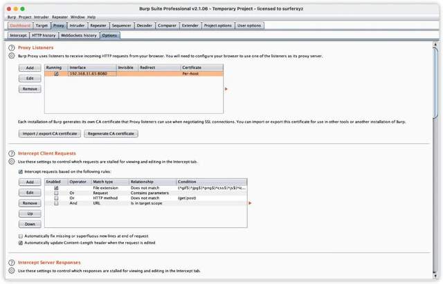下载后运行start_burp.bat或sh start_burp.sh来启动 Burp,然后打开代理设置,绑定到运行 Burp 的机器 IP,如下图所示: