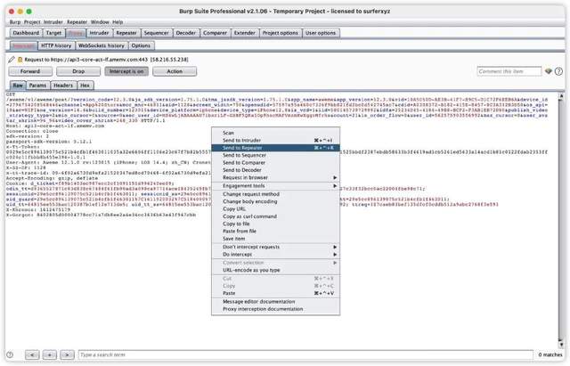 这一步骤设置之后,手机上的请求会在这里阻塞,你可以放行选择放行,或修改数据包后放行,也可以发往 repeater,以便后续重放请求,因此来自前端的请求是不可信的。