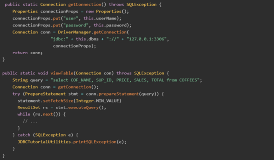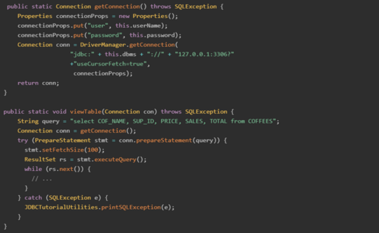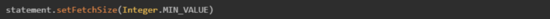 参考 JDBC API docs,网上很多教程需要设置useCursorFetch=trueResultSet.FETCH_REVERSE等,其实小编研究完JDBC驱动源码后发现,只需要设fetchSize=Integer. MIN_VALUE,其他配置均和默认配置保持一致即可。游标模式 Java demo 代码如下
