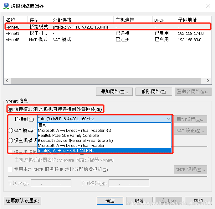 找到或新建VMnet0的网络编辑器,设置为桥接模式,桥接方式与你联网方式(WiFi,网线)关联(我是用的WiFi联网,所以桥接方式选择WiFi)