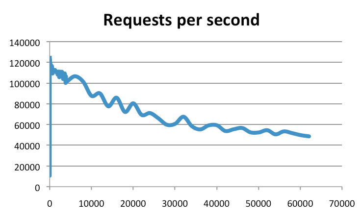 但是如果你以为这就是 Redis 的真实吞吐量,那就错了。实际上,Redis 官方的测试结果是可以达到 10 万的吞吐量,下图就是官方提供的一个基准测试结果(纵坐标就是吞吐量,横坐标是连接数):