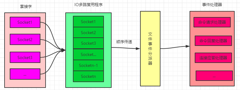 Redis 的文件事件处理器以单线程的方式运行,其内部使用了 I/O 多路复用程序来同时监听多个套接字(Socket)连接,提升了性能的同时又保持了内部单线程设计的简单性。下图就是文件事件处理器的示意图: